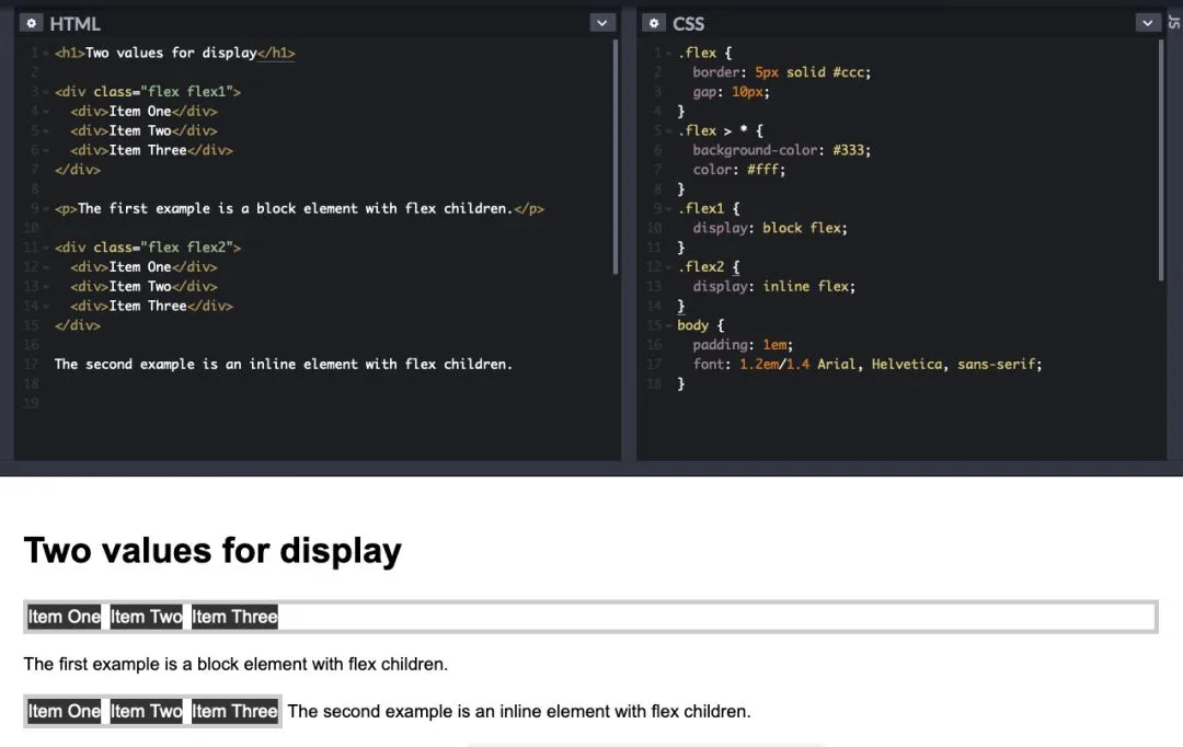 display: grid 和 display: flex 对一个元素的产生了对外和对内两方面的影响。当一个原本是内联元素 span 的 display 属性被设置为 flex,这个 span 元素就会变为一个块级元素,但其子元素却变为 flex 元素。如果我们想要这个被应用 display: grid 或 display: flex 的元素保持内联效果不变,则可以设置其为 display: inline-grid 或 display: inline-flex。
