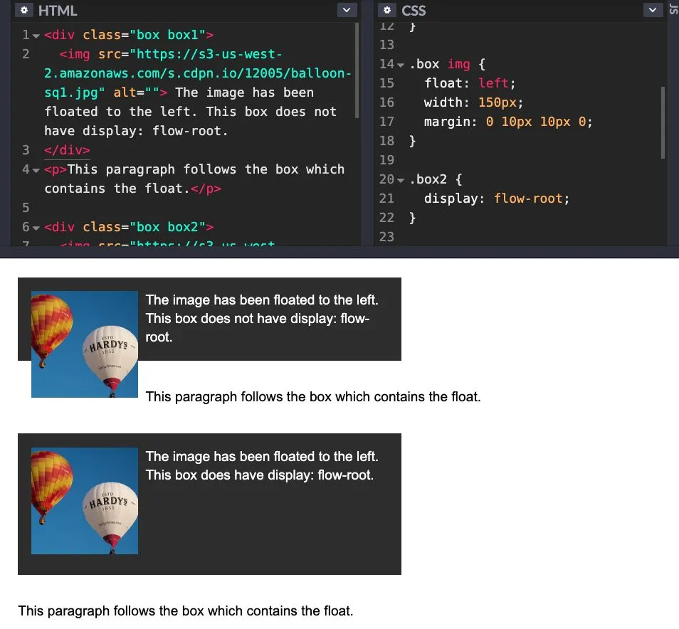 下面的示例中展现了应用 flow-root 及未应用的区别。