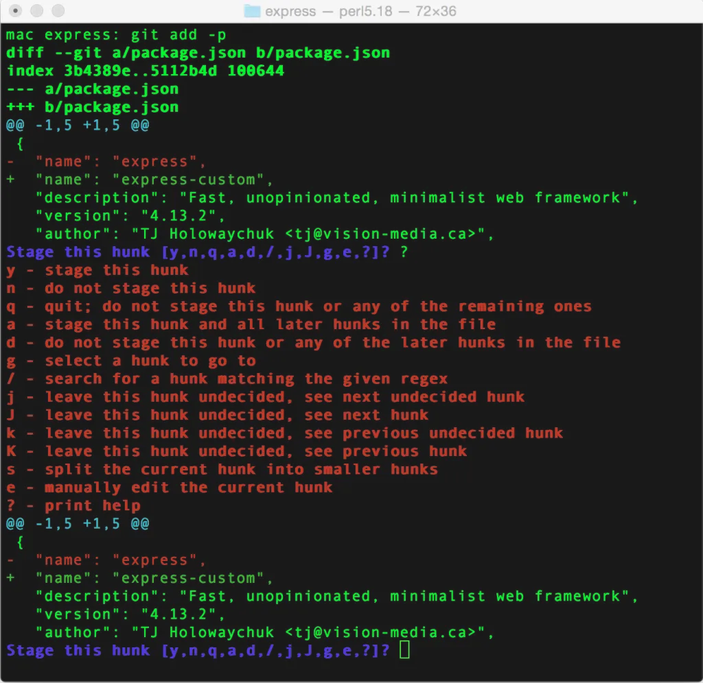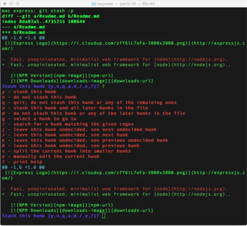 还记得神奇的 -p 命令吗?是的,它与 git stash 一起用会非常方便。你现在或许已经猜到了,它会询问你想备份哪些文件的变更。