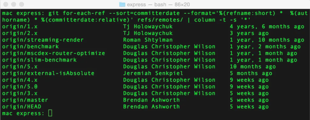 git for-each-ref –sort=committerdate –format='%(refname:short) _ %(authorname) _ %(committerdate:relative)' refs/remotes/ | column -t -s '\*' .