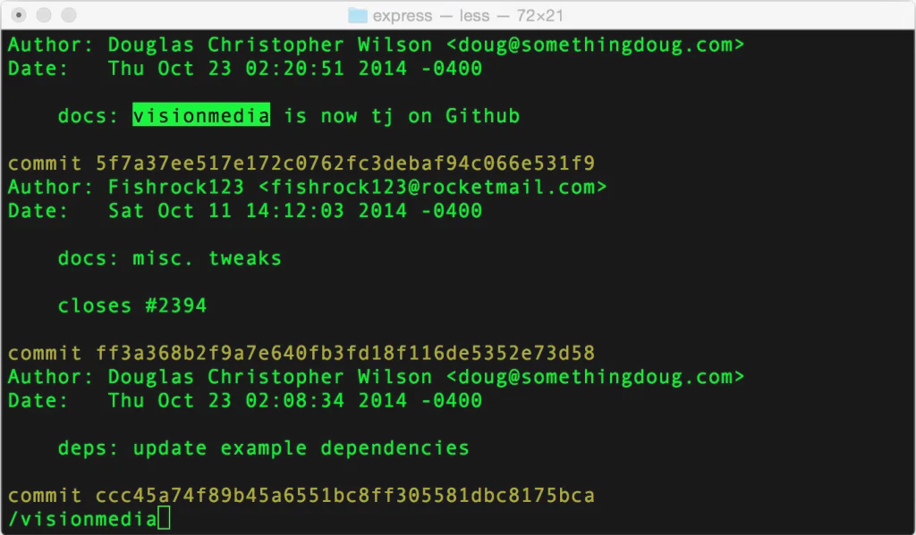 例如,曾经有位主管要求在每周五提交周报。所以我每周五都运行一下这个指令: git log --author="Alex Kras" --after="1 week ago" --oneline,然后将输出结果编辑一下,发送给主管审核。