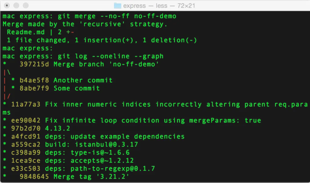 如果你想强迫 git 保存分支的历史,与合并同步请求的状况类似,你可以加一个 --no-ff 标志, 最后可以看到非常清楚的提交历史树。