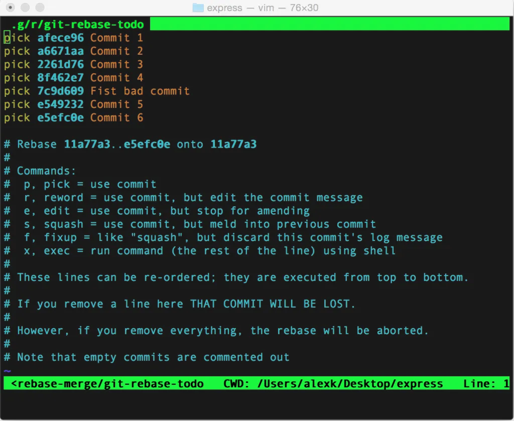 或许,最好的方法是使用交互式变更基线,调用命令为 git rebase -i {{某个提交序列号}}。运行这条命令,会打开一个带有自解释指令的编辑器。由于变更基线不在本文的叙述范围之内,我们就此而止,不再深究。