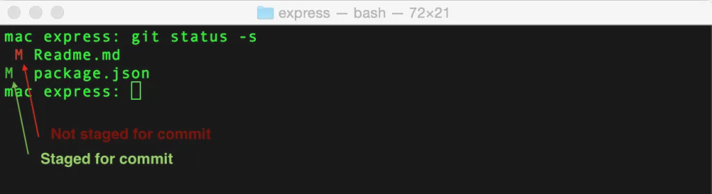 通过运行 git status 可以看到关于文件的描述以及文件的状态。 运行 git add filename.js 命令可以将文件从未暂存状态移动到暂存并准备提交的状态, 或者使用 git add . 命令一次性暂存所有的文件。